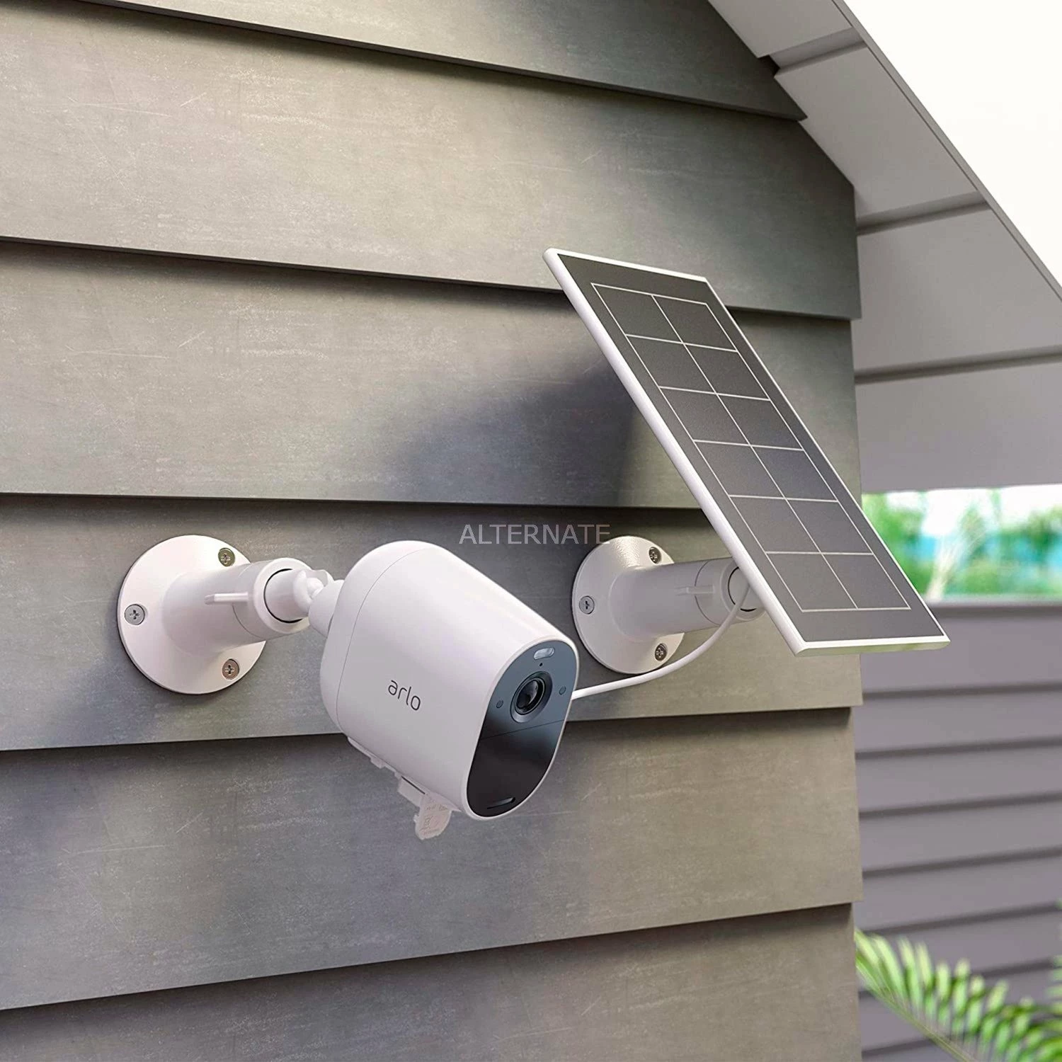Das Arlo Essential Solar Panel Ladegerät hält den Akku bei direkter Sonneneinstrahlung geladen. Das wetterbeständige Design, das ca. 2,4 Meter lange Stromkabel und die verstellbare Halterung machen die Installation einfach.