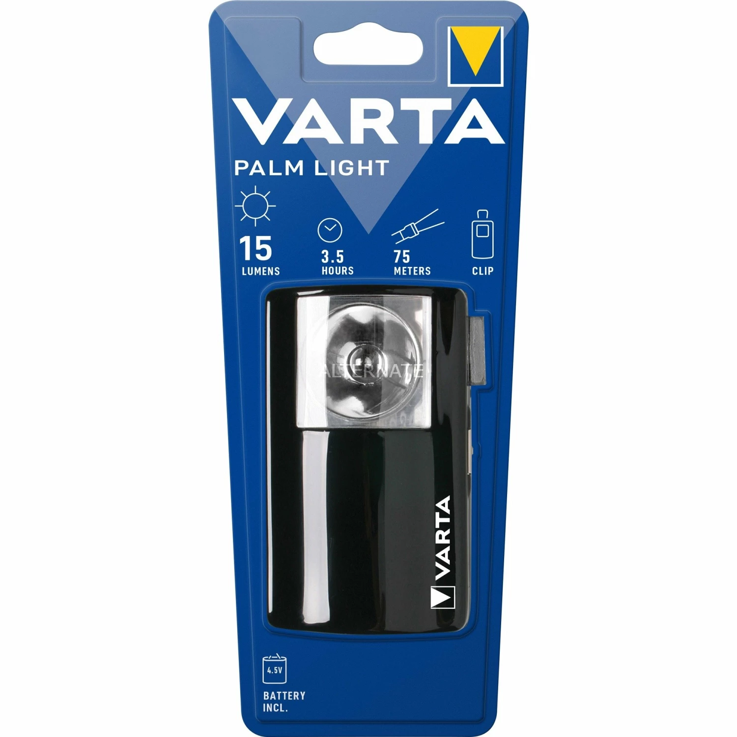 Das Palm Light von Varta ist eine einfach zu handhabende Taschenlampe mit einer Leuchtkraft von bis zu 15 Lumen. Sie wird mit einer 3R12 4,5-Volt-Batterie betrieben und verfügt an der Oberseite über einen praktischen Clip zum Aufhängen. Die Leuchtdauer dieser Lampe liegt bei bis zu 3,5 Stunden.